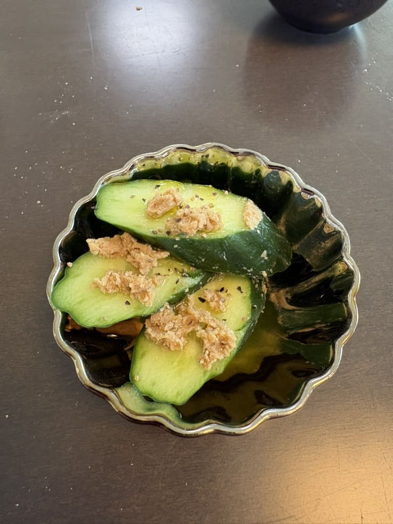 Il y a les concombres en asazuke, marinés légèrement au sel, au mirin bio et au kombu, d’une fraîcheur presque croquante. Un producteur de Kyoto, Tomiya, les vend dans de petits sachets illustrés au graphisme traditionnel soigné. On en a acheté un, mangé dans la rue en marchant. C’était exactement ce qu’il fallait.