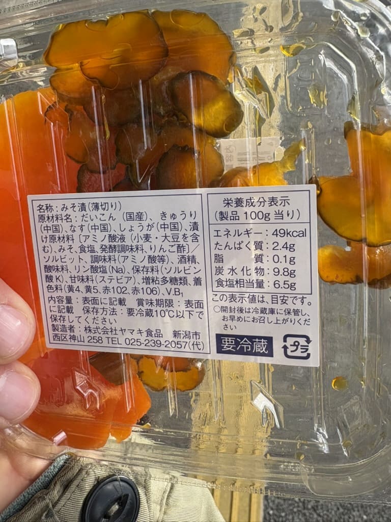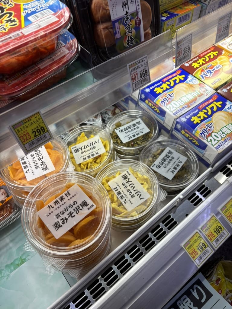 Plus loin, les misozuke de Niigata, légumes marinés dans le miso de la région, dits Echigo misozuke. Quatre légumes différents dans la même barquette, teintés d’un orange ambré profond par la fermentation. Le daikon y prend une douceur et une complexité qu’on n’attendait pas du tout. À côté, des coupelles individuelles de daikon au miso de blé (mugi miso) style Kyushu, vendu à l’unité, pour manger là, maintenant, debout devant le rayon si on veut.