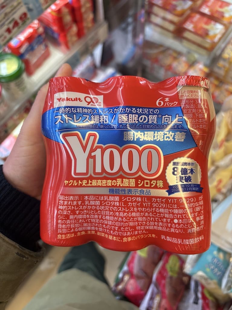 Le Yakult Y1000 d’abord, qu’on connaît vaguement en Europe dans sa version classique. Ici, la version premium ultra-concentrée en bactérie L. casei Shirota, vendue en pack de six petites bouteilles rouges. Sur l’emballage : « amélioration de la flore intestinale », « réduction du stress », « meilleure qualité du sommeil ». Ce n’est pas un yaourt à boire, c’est presque un médicament doux.